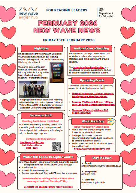 At New Wave English Hub, based in Hackney, we are committed to working with our regional schools in North London, Herts, Peterborough and Cambs to ensure the best possible outcomes in phonics, reading, early language development and instil a life long love of reading. To find out how we can support you, please see our 2025-26 brochure here.