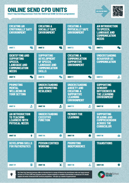 Online SEND CPD Units – This leaflet outlines the themes of the 20 units that are available. They’re a brilliant starting point for the entire workforce, suitable for any role or career stage within any setting. Because they’re so easy to access, flexible and feel bite-sized, we know that lots of classroom-based teachers and TAs find them really useful, as well as SENCOs and inclusion leads. Over 20,000 units have now been completed, and 99% of users tell us that their confidence in identifying and meeting the needs of their learners has increased.