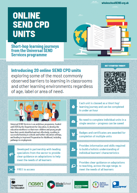 Online SEND CPD Units – This leaflet outlines the themes of the 20 units that are available. They’re a brilliant starting point for the entire workforce, suitable for any role or career stage within any setting. Because they’re so easy to access, flexible and feel bite-sized, we know that lots of classroom-based teachers and TAs find them really useful, as well as SENCOs and inclusion leads. Over 20,000 units have now been completed, and 99% of users tell us that their confidence in identifying and meeting the needs of their learners has increased.